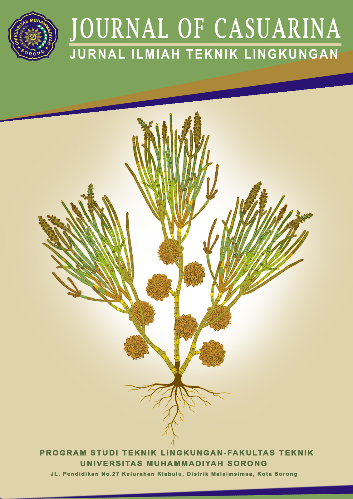 Judul Jurnal : CASUARINA Judul Tambahan : Environmental Engineering Journal Terbitan : 2 Jurnal Per-tahun Waktu : April and Oktober Status Jurnal : Akses Terbuka Pemimpin Redaksi : Anif Farida, S.Si., M.Sc. Redaktur Pelaksana : Azwar Rahmatullah, S.T., M.T Penerbit : LPPM Universitas Muhammadiyah Sorong Analisis Kutipan : Google Scholar | Garuda Rasio Penerimaan : 90% The Casuarina adalah jurnal di bidang Teknik Lingkungan dengan ruang lingkup terdiri dari Manajemen dan Kebijakan Lingkungan, Mitigasi Dampak Lingkungan, Konservasi Sumber Daya Alam, Pencemaran Lingkungan, Manajemen Kualitas Air, Ekologi Lingkungan, Sistem Informasi Geografis Lingkungan, dan Pengelolaan DAS Ramah Lingkungan. Jurnal ini menerbitkan artikel penelitian asli, ulasan, dan fitur khusus tentang teknik lingkungan. Jurnal ilmiah peer-review yang diterbitkan oleh LPPM Universitas Muhammadiyah Sorong (UNAMIN), Indonesia.
